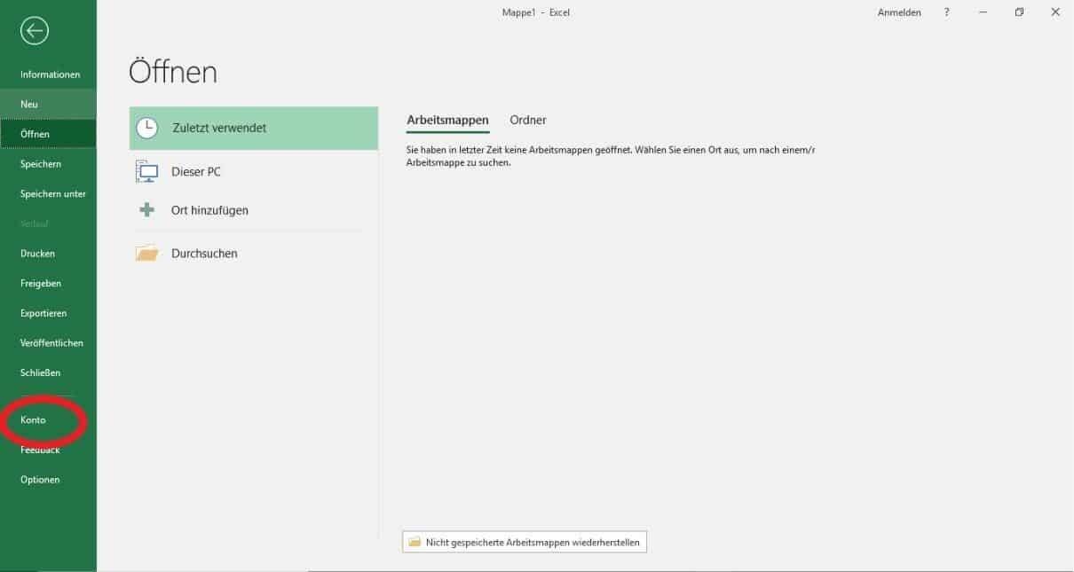 •  Klicken Sie nun oben links in die Reiter „Datei“ (rot markiert). In der Ansicht die sich nun öffnet wählen Sie den Menüpunkt „Konto“ aus, wie auf den folgenden Bildern zu sehen ist: