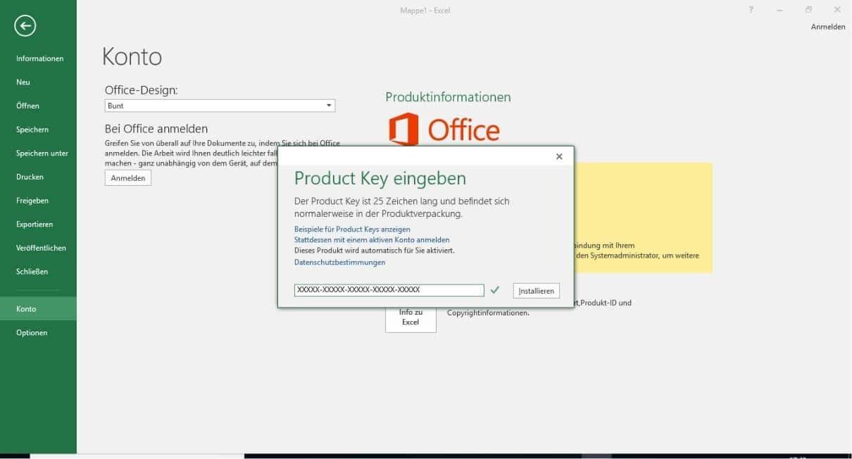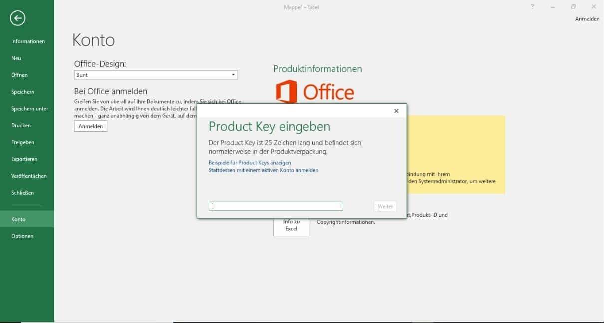 • Achten Sie bitte in diesem Fenster darauf, dass die Software keinem Microsoft-Konto zugewiesen ist. Sollte dies der Fall sein, so trennen Sie zunächst die Verbindung zu diesem Konto, bevor Sie die restlichen Schritte durchführen. Sollte Die Software noch keinem Konto zugewiesen sein, so erhalten Sie wie im obigen Bild sehen können auf der linken Hälfte des Bildschirmes eine Aufforderung zur Anmeldung, und auf der rechten Hälfte die Möglichkeit den Product Key zu ändern. Bitte wählen Sie die rechte Möglichkeit „Product Key ändern“ aus. Es erscheint anschließend folgender Bildschirm: