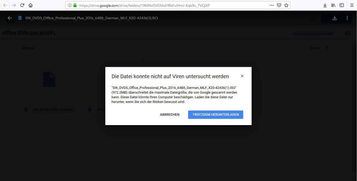 • Bitte haben Sie Verständnis dafür, dass die Software einfach zu groß ist, um vom Google Drive Virenscanner überprüft zu werden. Wir können Ihnen jedoch versichern, dass wir die Software selber zuvor mit einem Virenscanner überprüft haben und diese zudem selbst auf unseren Geräten im Unternehmen verwenden. Klicken Sie also auf den Button „Trotzdem herunterladen“.