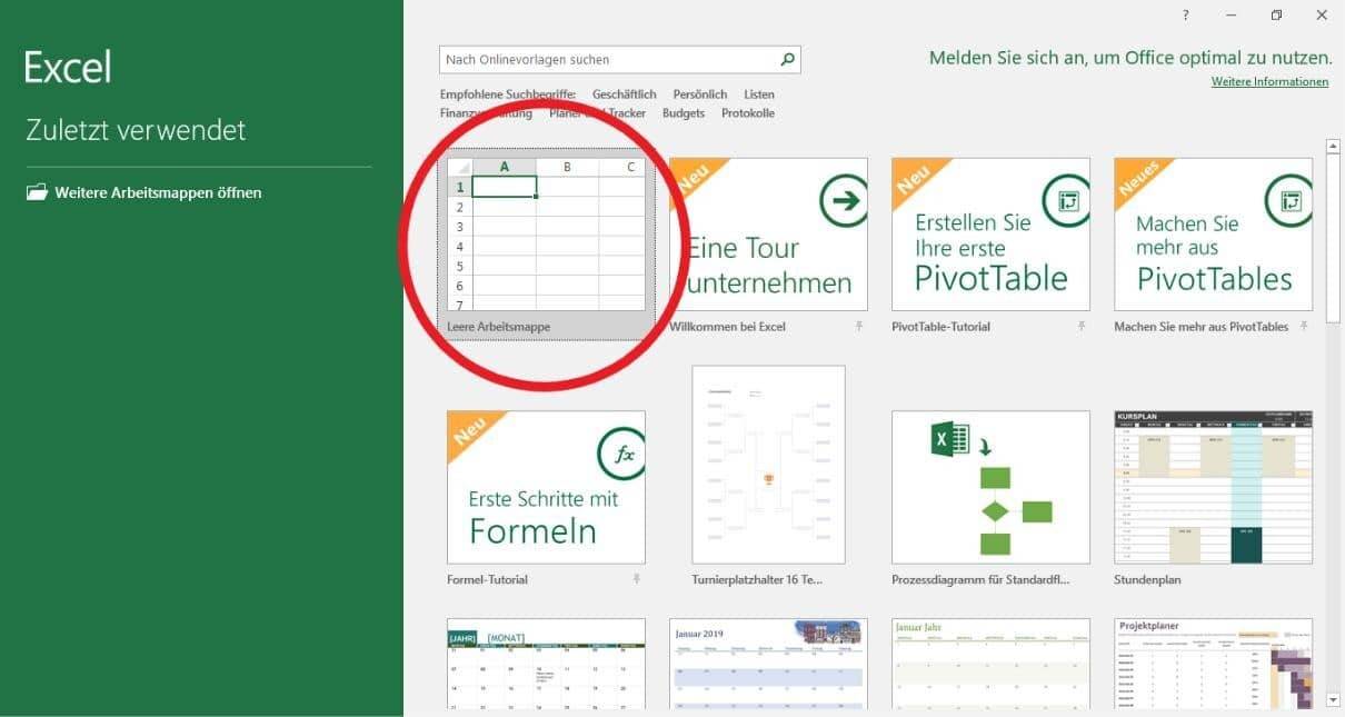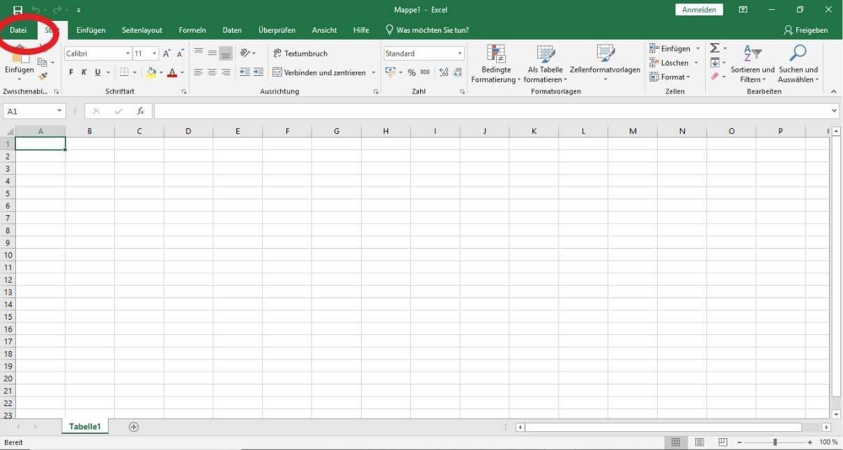 • Wählen Sie nun oben links den im Bild markierten Button „Leere Arbeitsmappe“ und klicken darauf. Es öffnet sich eine neue leere Arbeitsmappe: